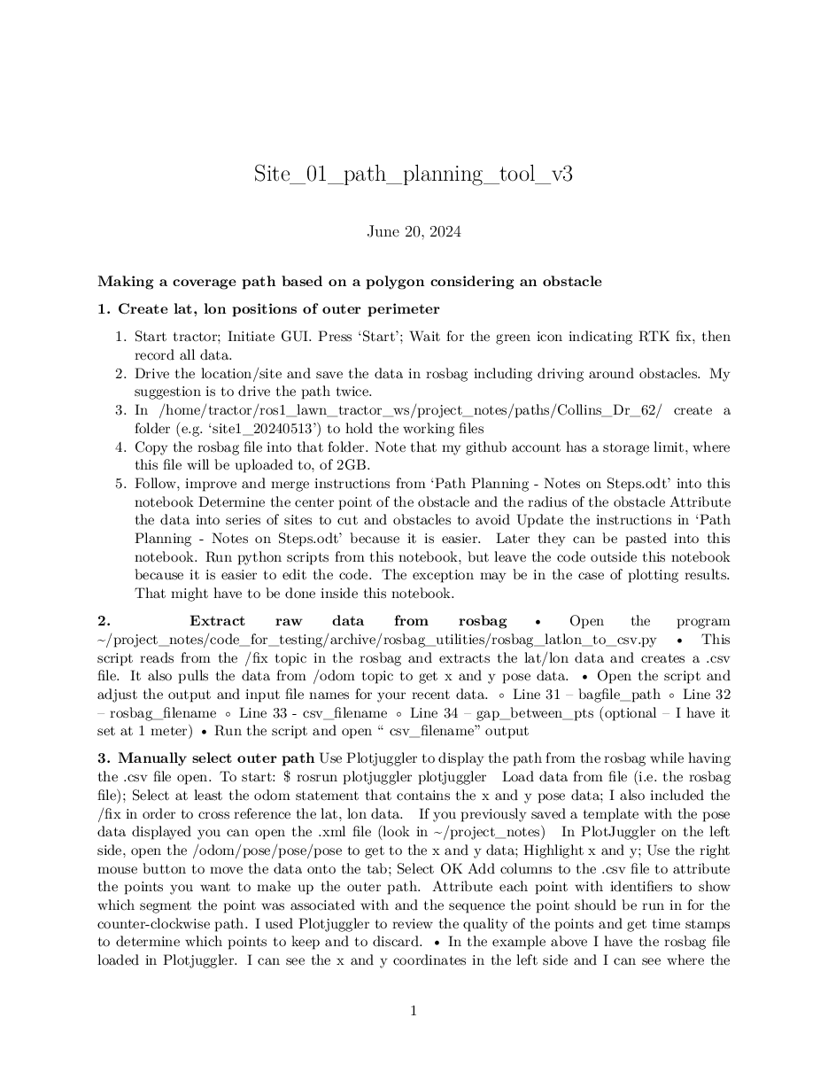 Chat/Notes: Al's Miro board: https://miro.com/app/board/uXjVM1yzdFo=/ Al's github: https://github.com/jones2126/ Al's Jupyter Notebook directory. https://github.com/jones2126/ros1_lawn_tractor_ws/tree/master/project_notes/jupyter_notebooks Example named entries in the index file: http://sampson-jeff.com/RosAgriculture/LawnTractorMeetingNotes.htm#20241107 http://sampson-jeff.com/RosAgriculture/LawnTractorMeetingNotes.htm#20240822 http://sampson-jeff.com/RosAgriculture/LawnTractorMeetingNotes.htm#20240509 http://sampson-jeff.com/RosAgriculture/LawnTractorMeetingNotes.htm#12012022