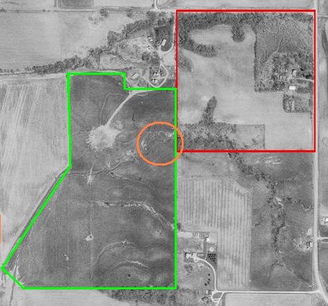 The red area is my parent's farm. It is 40 acres. The green area is the pasture land of a neighbor's farm. The non-tree area on my parent's farm gets planted with crops every season. So it is only available from late fall to early spring. The green area is available all year round. It is closely timmed grass and is mostly barren of trees. There are a some hills and valleys.