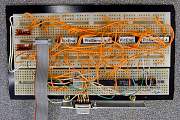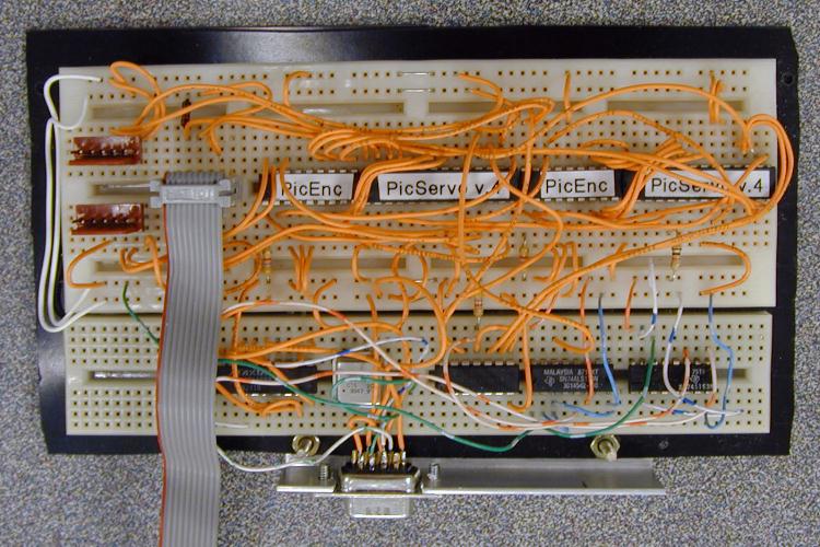 This is the PIC-SERVO prototype that I built for the Research 2 robot. It has two PIC-SERVO channels and an RS-232 convertor. I plan to layout a PC board for this. This controller will connect to the quadrature encoders and to the motor driver boards. It will communicate with a processor over a serial interface.