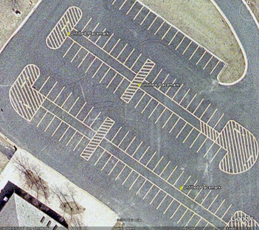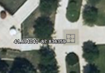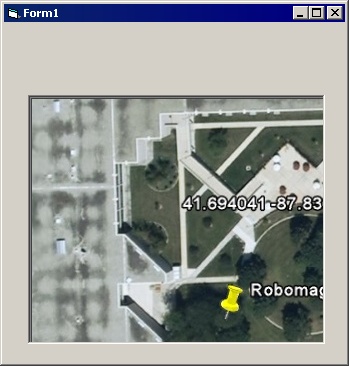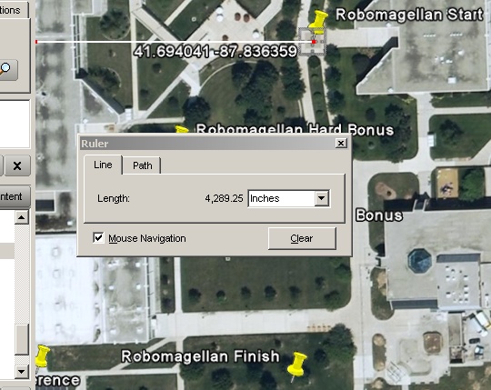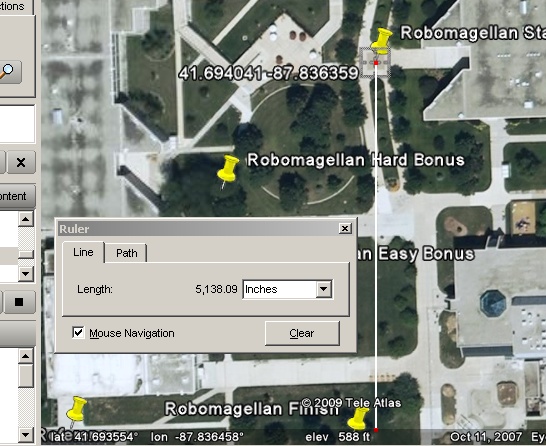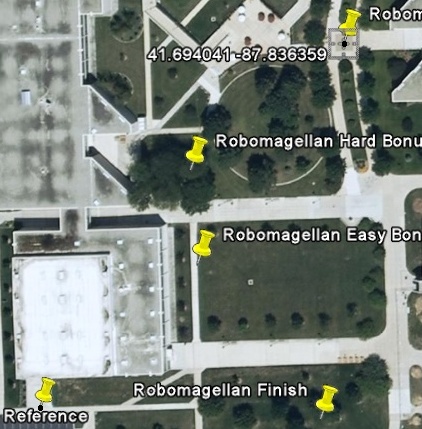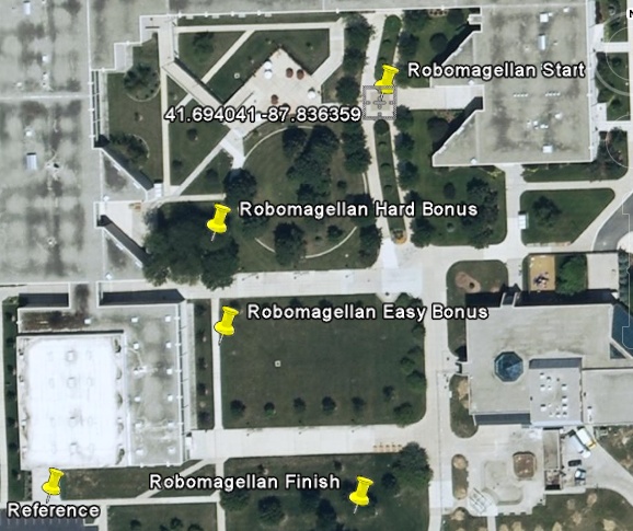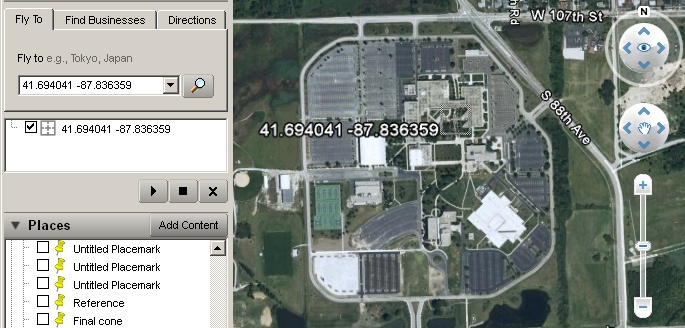 Here is the starting location of the Spring 2008 ChiBots Robomagellan competition. (41.694041 -87.836359) You can type these values into the search box in Google Earth and it will "Fly" to that location as shown below.