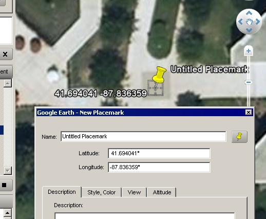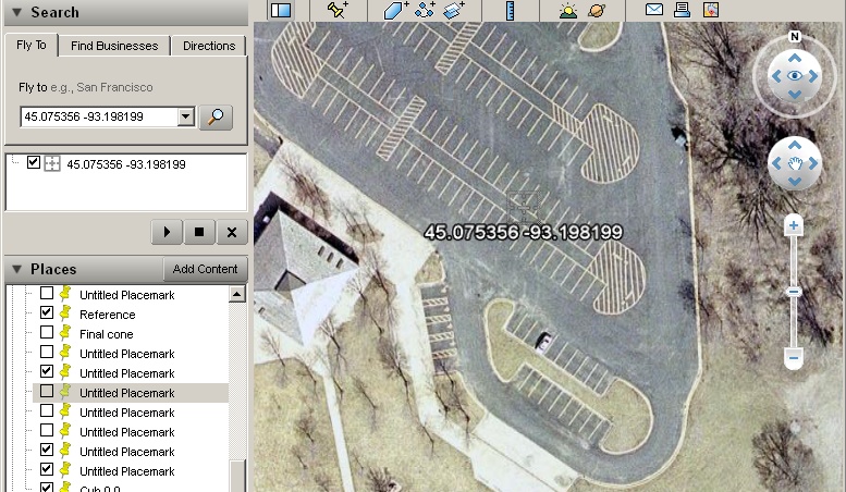 These push-pins are important because they do two things for us. First they give us a marker that we will use later as visual reference points. Second they give us locations in the real world. In my case I used the latitude and longitude values from Google Earth and I typed those into my program to identify those points. As we will see later we can use distances instead of latitude and longitude.