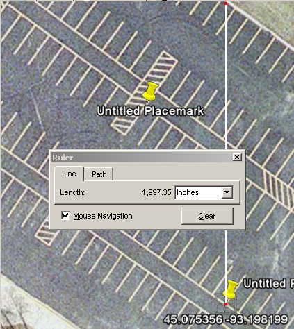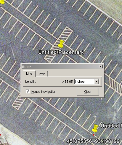 As I mentioned earlier I use the latitude and longitude values from Google Earth. Lets look at just using measurements from Google Earth. Using the ruler function in Google Earth I can measure a distance in various units. So I chose to use inches. It is easy to measure a diagonal from start to end. But I need the x distance and the y distance. So I slid the image to the left so the "Reference point is against the edge. Now I can use the ruler to measure from the "Start" point to the left edge, like this: