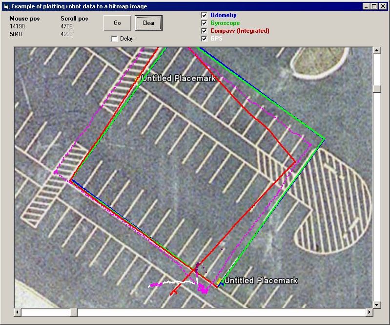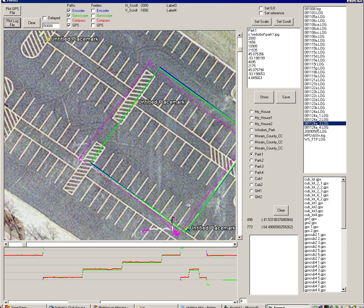 It is displaying the same log file that we used above. This application lets me click a geographic selection and it automatcally displays the image, sets the scale and it sets the preferred scroll location. Then I can click on one of the file list boxes and select either a log file or a GPS file. The box at the bottom of the screen is a plot of compass (red), odometry (blue) and gyroscope (green).