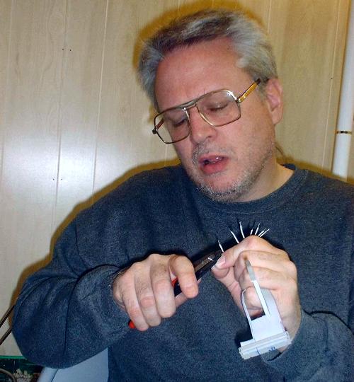 ![]() We decided it would be easier to just put SIP sockets on the end of ribbon cable. So Jeff is cutting the connectors to size. (And no one thought to say Don't do anything too stupid.) |
