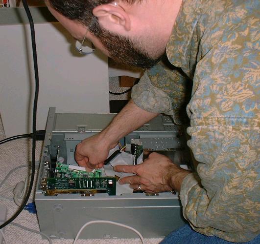 We started out by running a cable from the office area to the workshop. We installed a network card in the computer. After some playing around we had Linux talking to the Internet.