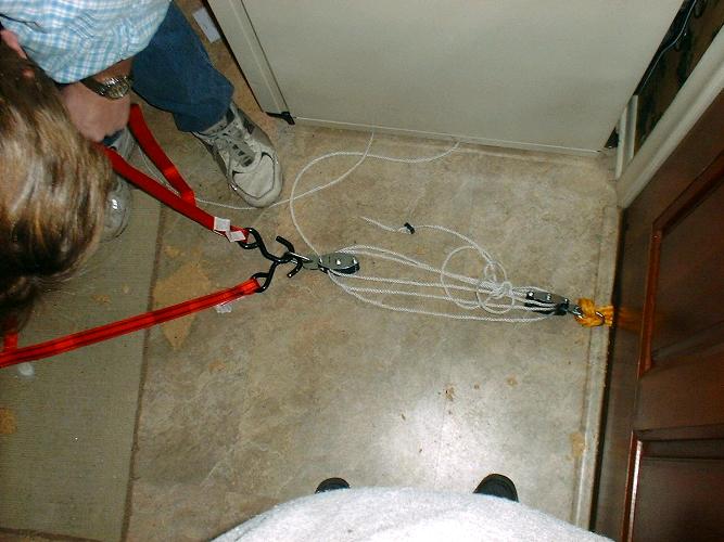 ![]() That can't possibly work. We had a rope under the door tied to the truck. Then a block and tackle. It is tied to the straps on the mill. |