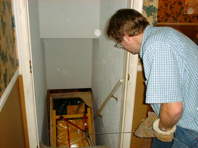 It is probably good we don't have pictures of this part... The mill wouldn't clear the plywood on the stairs. So I (Jeff) laid on the floor, my back against the door, and I pressed as hard as I could against the mill. Brynn proceeded to rock the mill violently back and forth so it would hop over the edge of the plywood. It started to go and Brynn grabbed the rope...