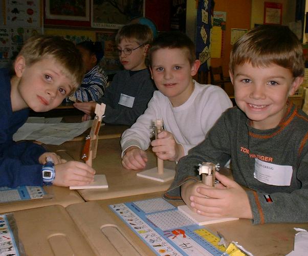 So you probably wondered why we were making big piles of paneling and dowels (and sawdust). Alan signed up to give a talk on robots at his son Peter's school. So Alan took his spare Puma robot arm, his Trippy robot, his Oscar robot and I (Jeff) took my Earth Explorer robot. Alan also decided to make model robot arms for the kids to assemble and take home.