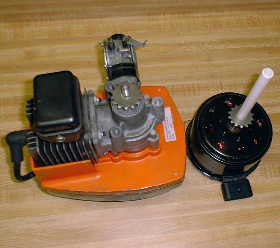 I (Jeff) have been talking about making an engine/generator for long range robotics. I have played with a 3HP 2-cycle engine and a car alternator. That works great but it is big and requires manual starting. I started a project with a 1HP 2-cycle engine and a DC motor for a generator. I never finished that. This is my latest attempt. It is a 1HP (1-1/2HP?) 2-cycle engine and an EV-Warrior DC motor. I wanted to use a toothed belt but I can't find my box of pulleys. I found these #25 sprockets. The engine and motor together will be about 11 inches long and about 7 inches high. Hopefully the motor will act as a starter and a generator.