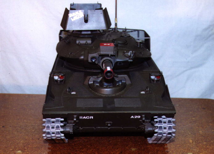 The model is 31 inches long, 13 3/4 wide and 14 1/2 high over the .50 cal. It weighs 65 pounds. It travels at .65 mph max in Lo Range, which is equivalent to about 5 mph in the full size M551. It travels at 2.5 mph max in Hi Range, which is equivalent to about 20 mph in the full size. Although the full size had a max speed of 43 mph it would be very difficult to control the model when running at that equivalent scale speed. The model will operate for about 2 1/2 hours in Lo Range and about 1 3/4 hours in Hi Range before requiring battery recharging. It will climb a 60% grade in both Lo and Hi range. There is a receiver and antenna inside the hull, which controls the Vantec, the turret drive motor and shifting of the drive module. With a separate receiver and battery pack in the turret, sliprings between the hull and turret are not required.